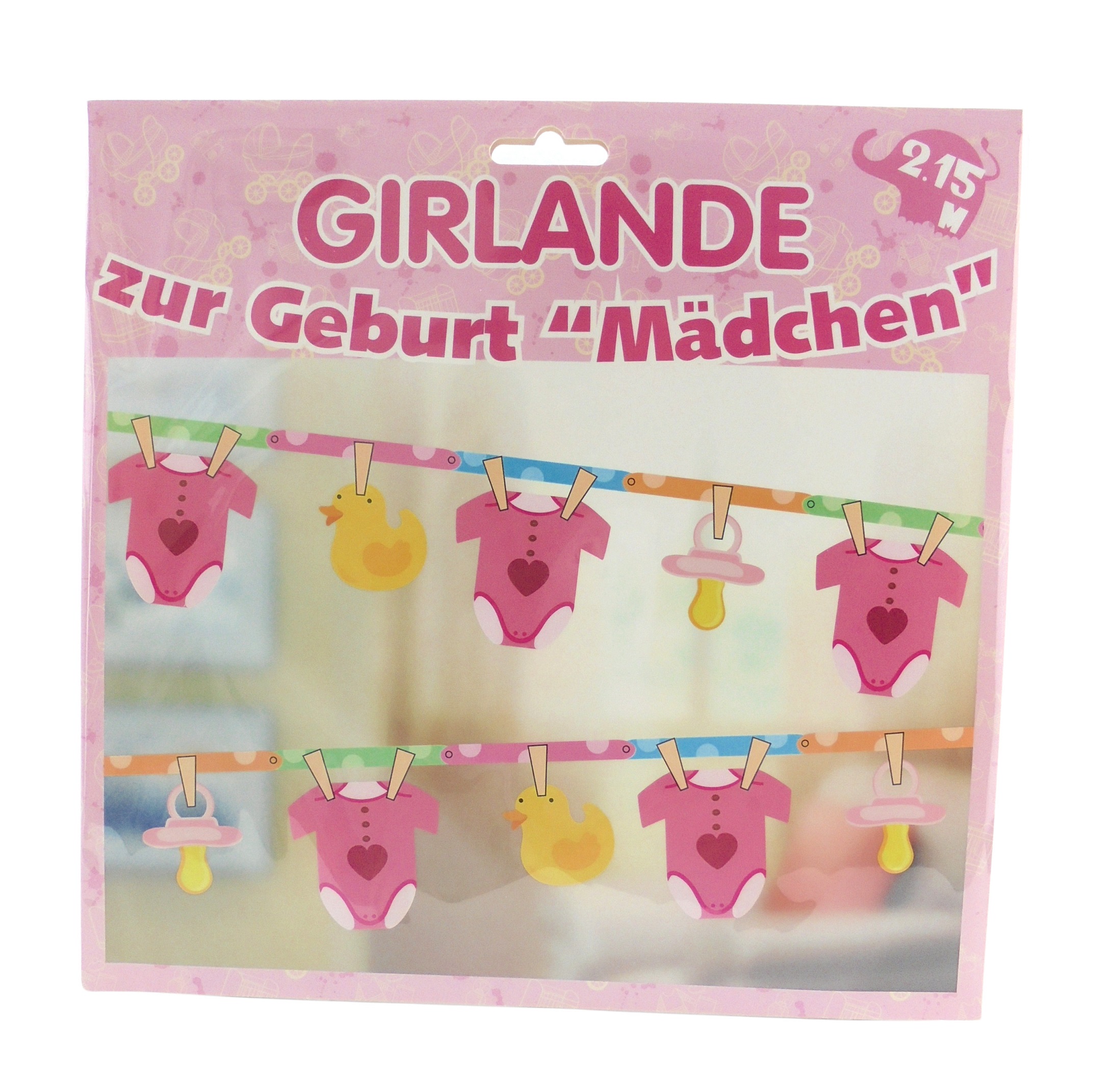 Die Motive, bestehend aus kleinen Stramplern, Schnullern und niedlichen Entchen sind aufhängt wie an einer Wäscheleine. Auf den Stramplern ist außerdem noch ein großes, rotes Herz abgebildet.