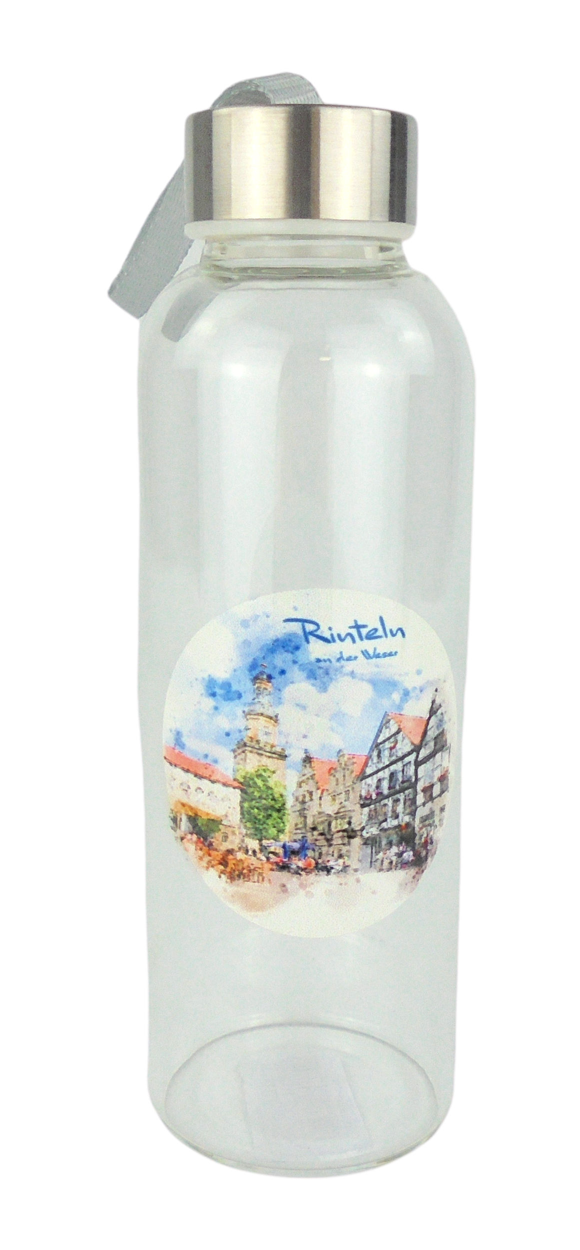 Ein besonderer Artikel aus unserem Rinteln-Sortiment ist diese tolle Glasflasche für Unterwegs. Verziert ist diese Flasche mit dem Motiv der malerischen Kulisse des Rintelner-Marktplatzes in Aquarell-Optik.