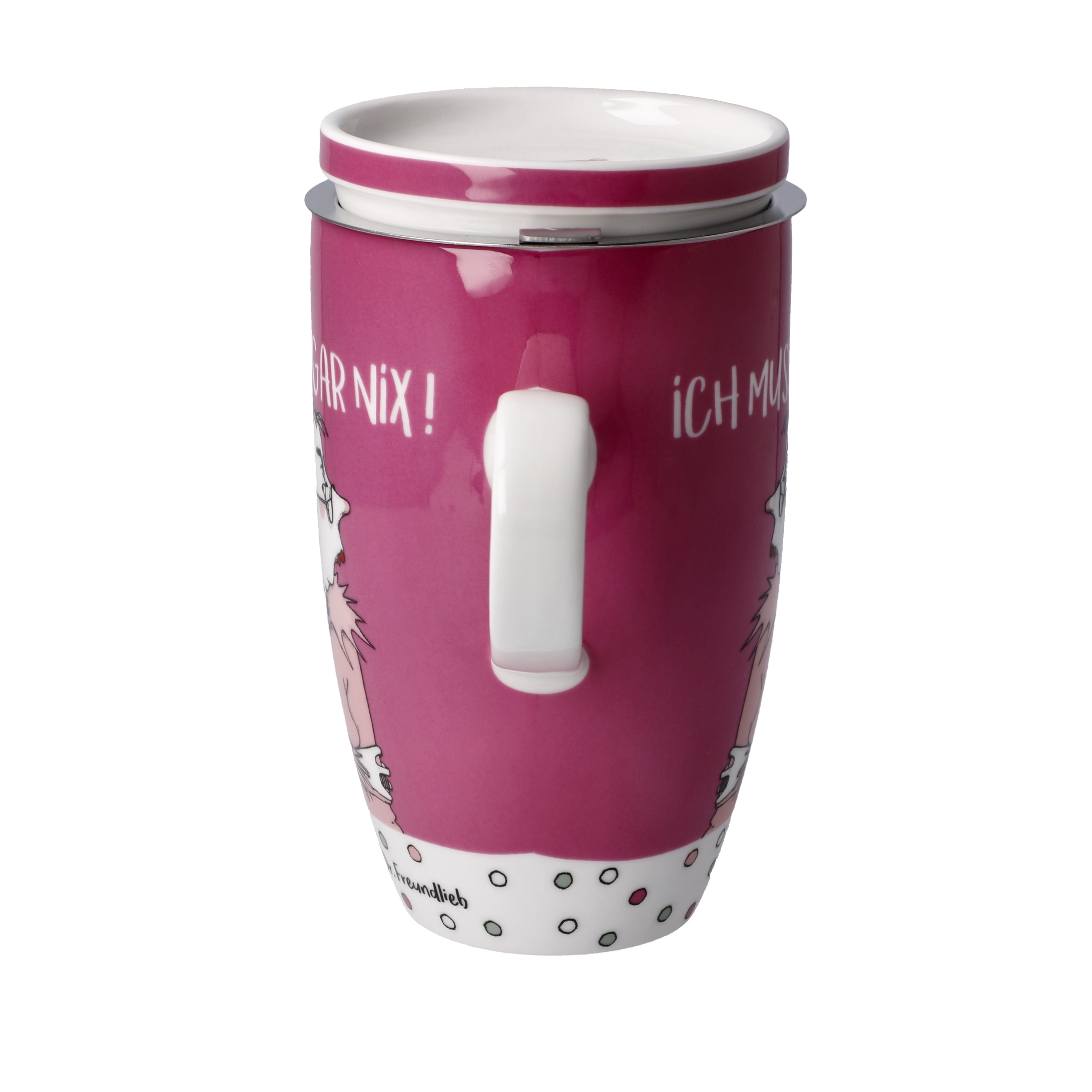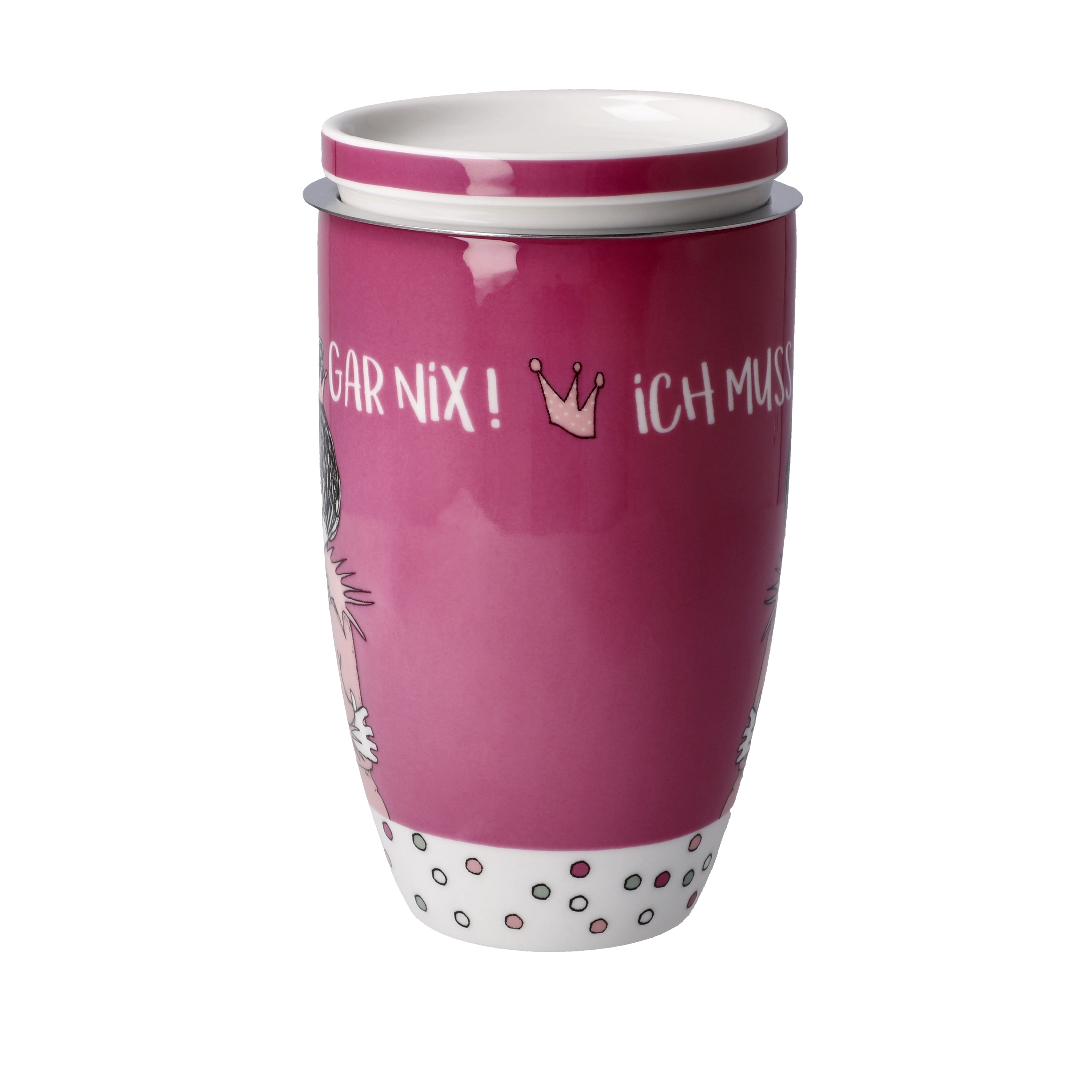 Die Teetasse mit Deckel und Sieb ist ein wunderbares Accessoire für alle Teeliebhaber. Mit ihren charmanten Illustrationen und witzigen Sprüchen von Dr. Barbara Freundlieb bringt sie Freude und Humor in den Alltag. Der hochwertige Deckel aus Porzellan hält den Tee bei der Zubereitung lange warm und dient gleichzeitig als praktische Ablage für das Sieb. Das Sieb aus rostfreien Stahl ermöglicht einen direkten Aufguss von losem Tee, ohne zusätzlichen Teefilter. Egal, ob Schwarztee, Grüntee oder Kräutertee – mit dieser Teetasse kann der Tee individuell zubereitet und genossen werden. Der Spruch „Ich muss gar nix“ auf der Tasse erinnert daran, dass es wichtig ist, sich selbst etwas Gutes zu gönnen und den Moment zu genießen. Diese Teetasse ist ein perfektes Geschenk für Teeliebhaber, die Freude an einzigartigem Design und witzigen Sprüchen haben.