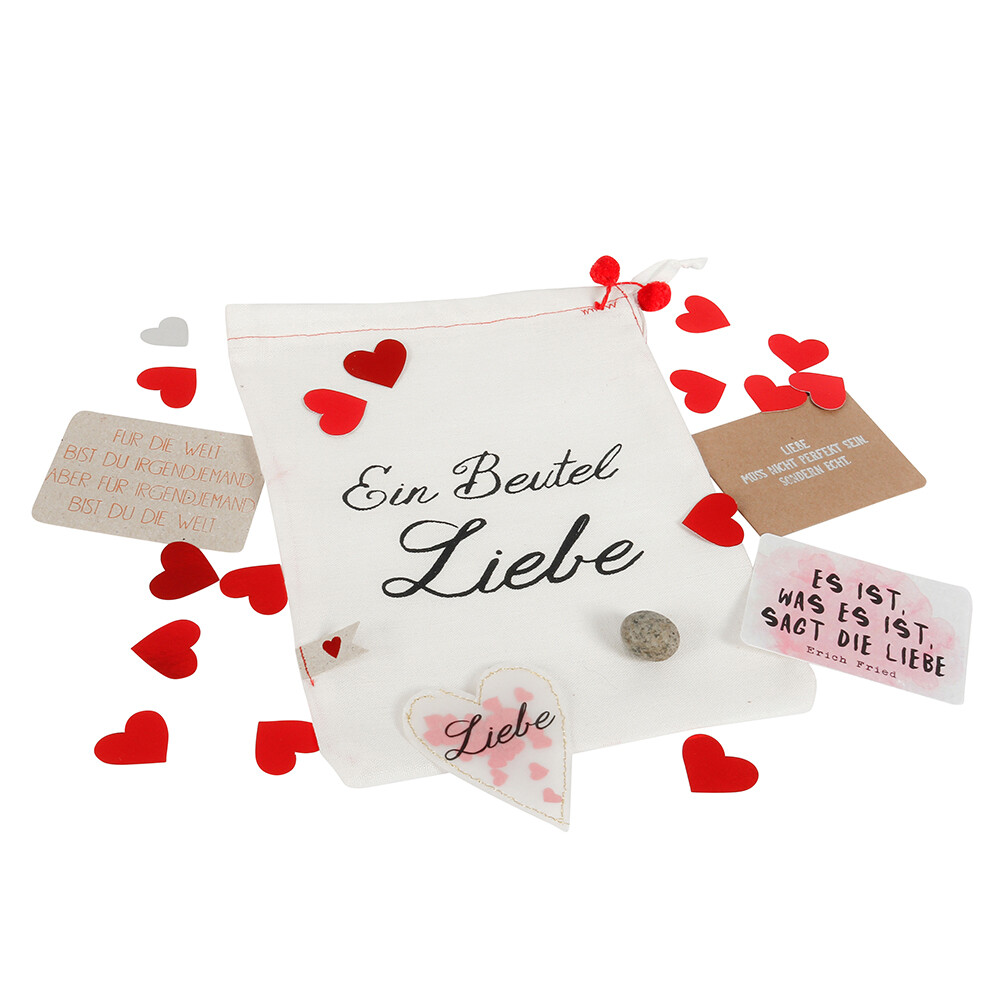 Der Wunderbeutel enthält bereits drei entzückende bedruckte Spruch-Karten, ein Konfettiherz, großes Streukonfetti und einen handbemalten Stein. Diese Elemente fügen einen Hauch von Charme und Persönlichkeit hinzu, aber der wahre Zauber liegt darin, dass der Beutel darauf wartet, von Ihnen mit weiteren Kleinigkeiten gefüllt zu werden. Ihre persönlichen Gegenstände, süße Botschaften oder kleine Überraschungen finden hier ihren Platz und machen das Geschenk noch individueller.