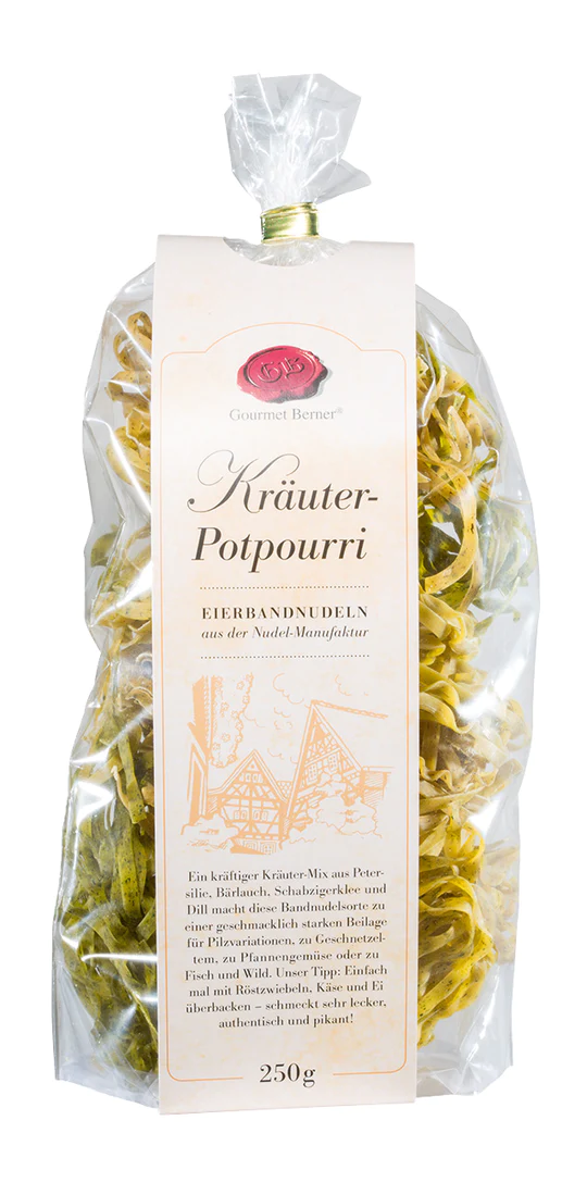 Entdecken Sie selbst die verlockende Welt der Gourmet Berner® Bandnudeln Kräuter-Potpourri und lassen Sie sich von ihrem einzigartigen Geschmack verzaubern. Denn mit diesen Nudeln wird jede Mahlzeit zu einem Fest der Sinne und einem unvergesslichen kulinarischen Erlebnis.