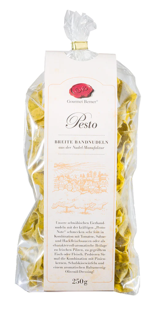 Feinschmecker aufgepasst! Die neueste Kreation von Gourmet Berner® ist da, um Ihre Geschmacksknospen zu verwöhnen: Die Gourmet Berner® Bandnudeln Pesto. In einer praktischen Packung mit einem Inhalt von 250g vereinen diese Nudeln die Tradition schwäbischer Kochkunst mit einem Hauch von mediterranem Flair.