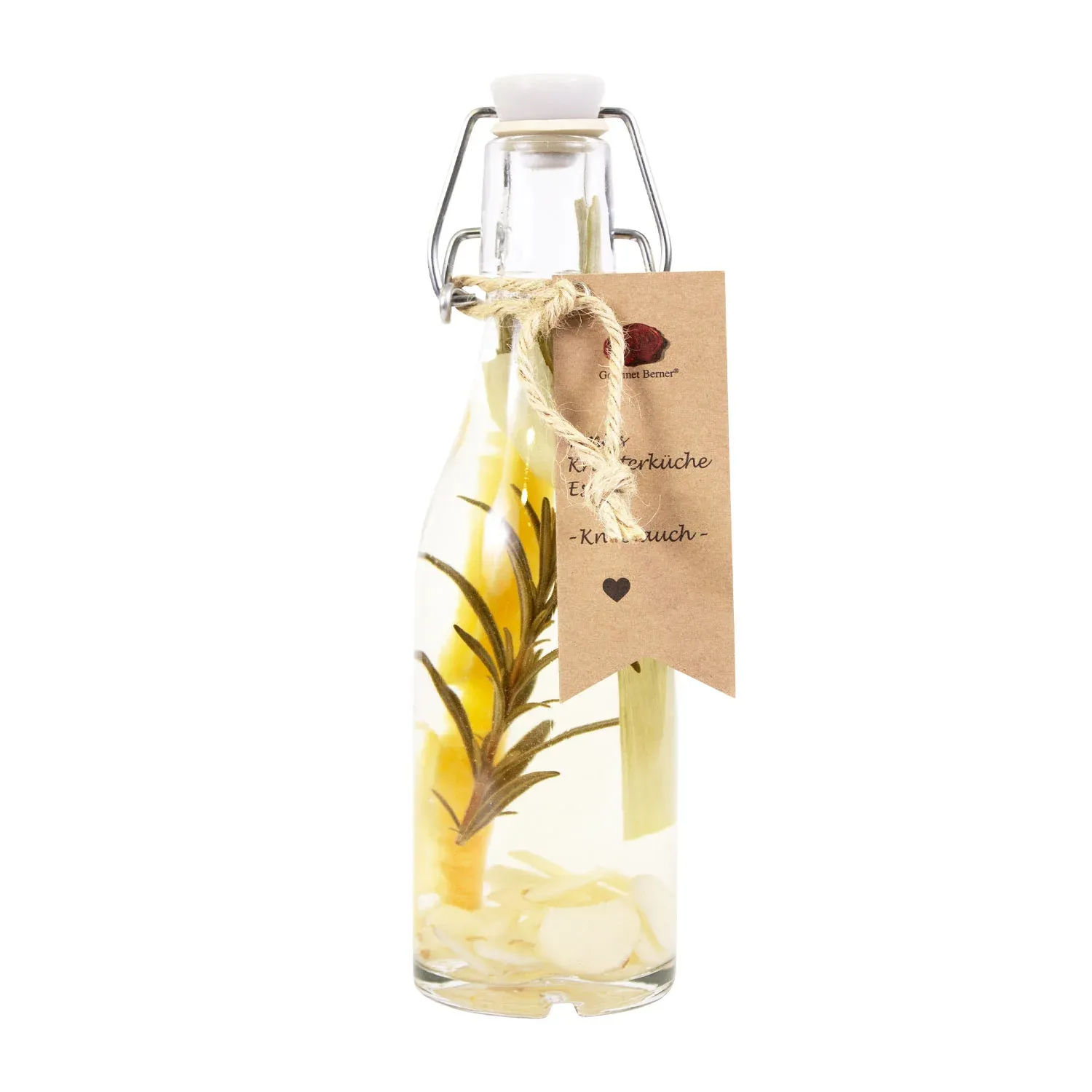 Die Grundlage bildet ein milder Tafelessig mit 5 % Säure, der durch eingelegte Knoblauchscheiben seinen typischen, würzigen Charakter erhält. Doch damit nicht genug: Rosmarin, Karottenstück und Lauch verleihen dem Essig zusätzliche Tiefe und machen ihn zu einem echten Alleskönner in der kreativen Küche. Gleichzeitig ist dieser Essig auch optisch ein Highlight – in der rustikalen Glasflasche mit dekorativem Bügelverschluss entfalten sich die eingelegten Zutaten zu einem echten Blickfang.