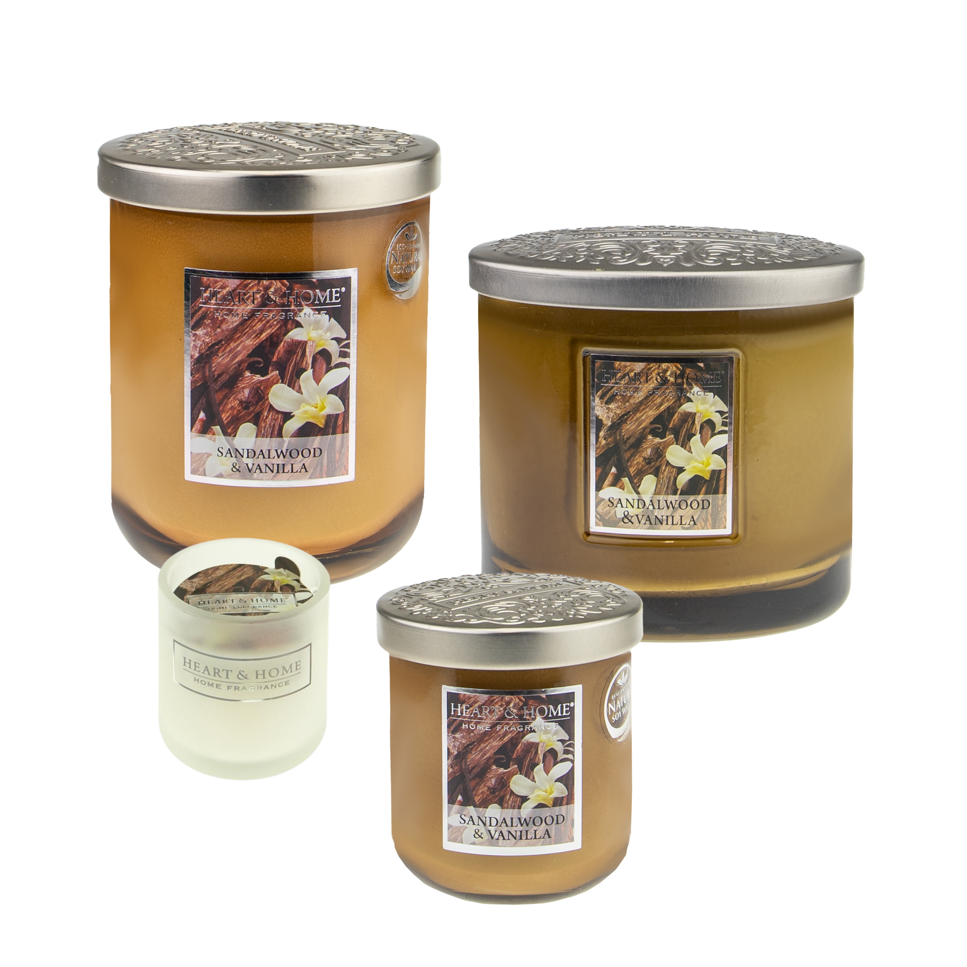 Die Heart & Home Duftkerzen und Raumdüfte sind so konzipiert, dass sie überall schön aussehen. Wie die Ellipse Twin Wick in einer modernen Ellipsenform aus farbigem Glas. Aber natürlich sind die Kerzen wie gewohnt auch in den runden Gläsern zu haben. Etwas kleiner ist der “Sandalwood & Vanilla”-Duft auch als Votivkerze im Glas verfügbar.