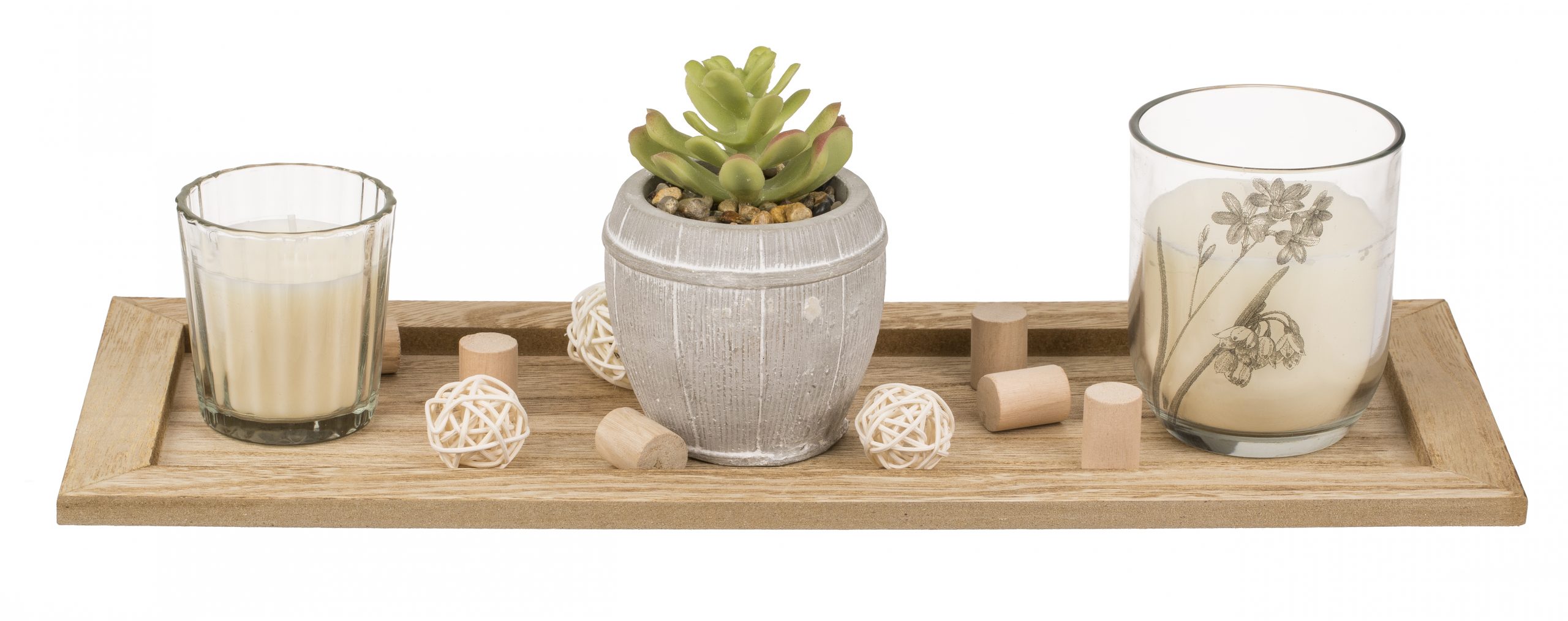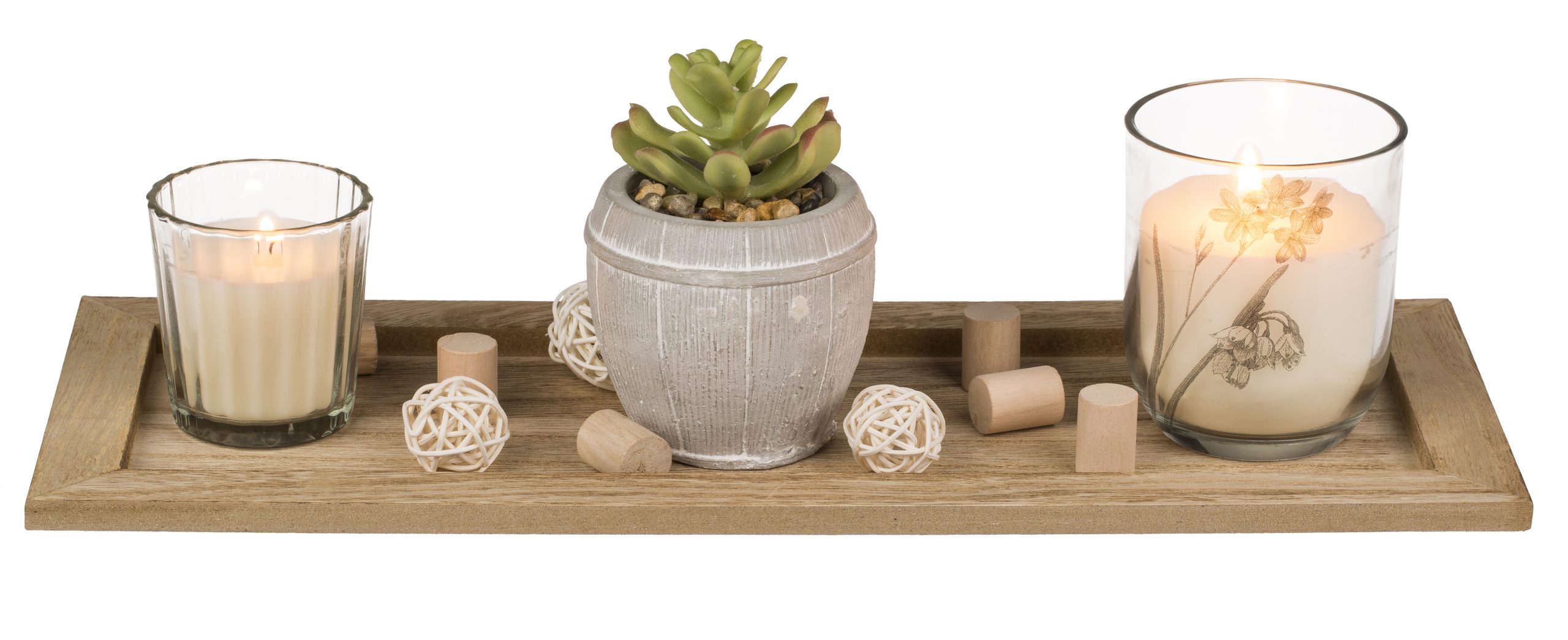 Verleihen Sie Ihrem Zuhause eine Atmosphäre der Gemütlichkeit und Eleganz – mit diesem bezaubernden Set aus Kerzen, Sukkulente und Holz-Tablett. Ein perfektes Accessoire, um jeden Raum in ein stillvolles Wohlfühlparadies zu verwandeln.