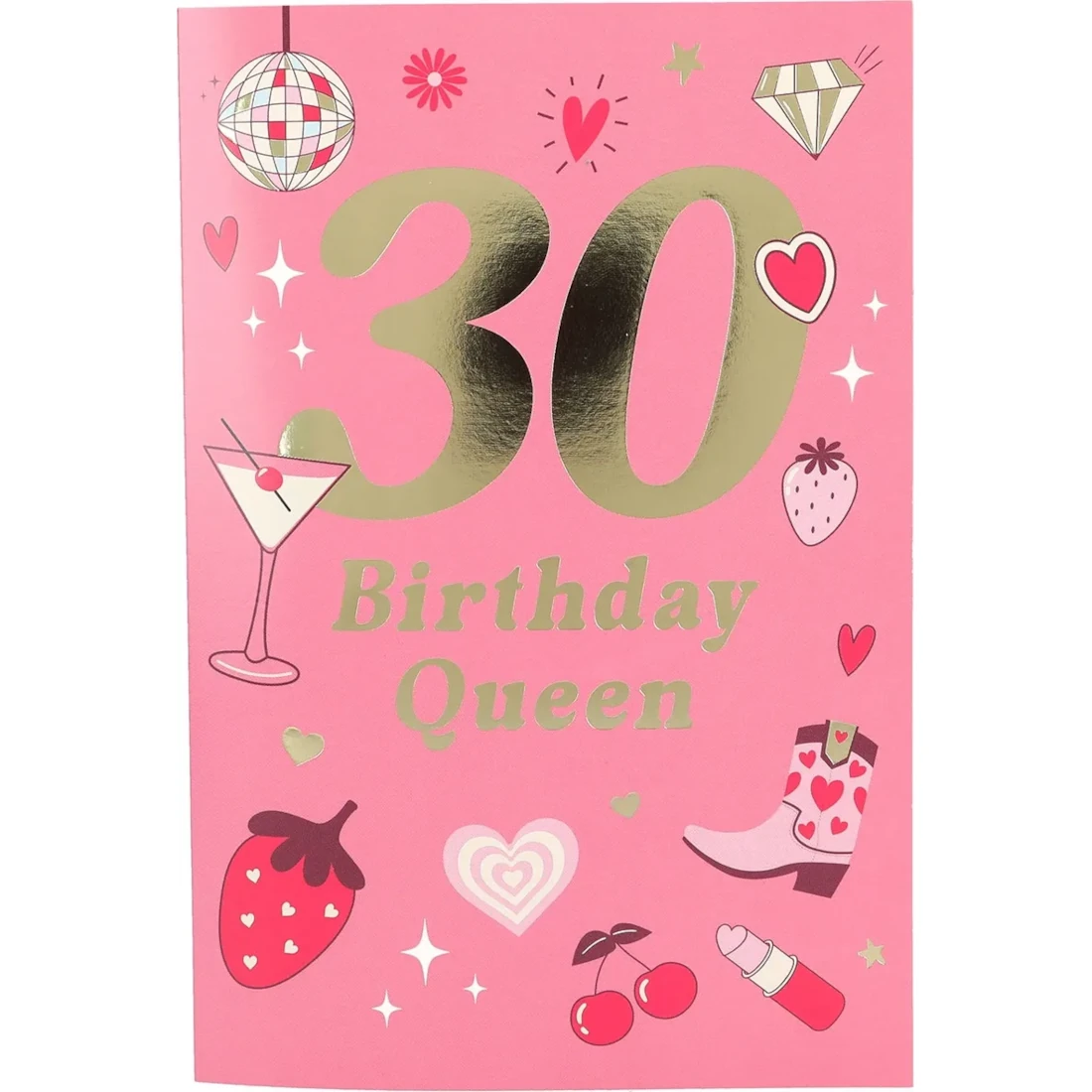 Schon die Vorderseite zieht alle Blicke auf sich: Ein kräftiger pinker Hintergrund, darauf die große, goldene „30“ und der elegante Schriftzug „Birthday Queen“ in glänzendem Gold. Umgeben wird das Ganze von zahlreichen verspielten Motiven – darunter Erdbeeren, Lippenstift, Stiefel, Kirschen, Herzen, Martiniglas und eine Diskokugel. Diese kleinen Details erzählen eine Geschichte: von Lebensfreude, Weiblichkeit und der perfekten Partynacht!