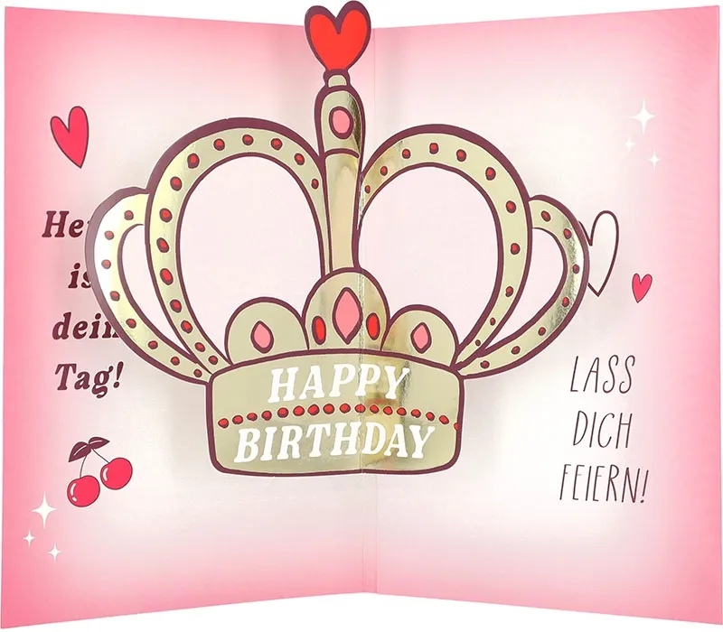 Doch der eigentliche Wow-Moment wartet im Inneren: Öffnet das Geburtstagskind die Karte, ertönt der legendäre Hit „Dancing Queen“ – und mit einem fröhlichen Jump-Out-Effekt springt eine große, goldene Krone mit der Aufschrift „Happy Birthday“ hervor. Dazu leuchtet die Botschaft: „Heute ist dein Tag! LASS DICH FEIERN!“ Ein musikalischer Moment voller Glanz, der zeigt: Heute steht die Queen des Tages im Mittelpunkt!
