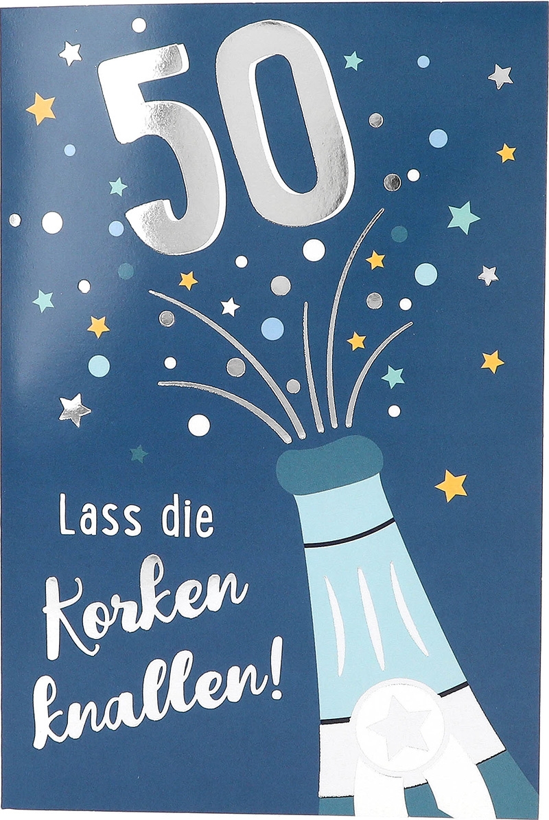 Die blaufarbene Front der Karte ist ein echter Blickfang. Eine elegante Sektflasche ziert das Zentrum, aus der eine “große 50” fröhlich heraussprudelt. Der Spruch “Lass die Korken knallen” rundet das festliche Design ab und verspricht eine Feier voller Freude und Frohsinn.