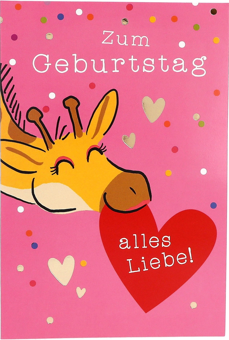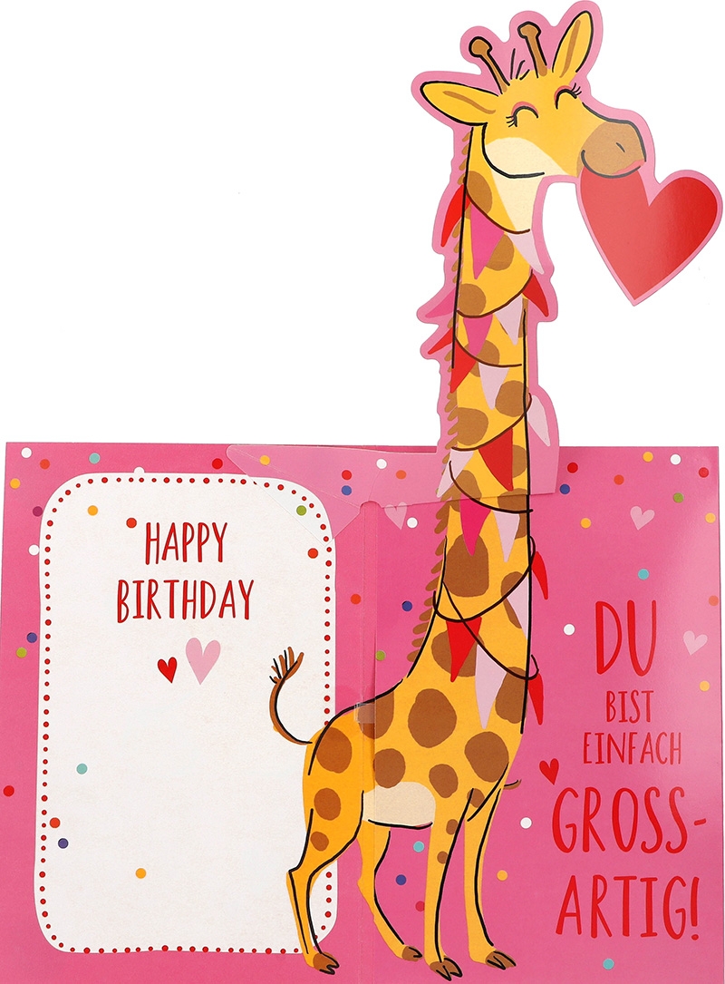 Die Vorderseite der Karte strahlt in einem fröhlichen Rosaton, geschmückt mit bunten Punkten und einer entzückenden Giraffe, die ein Herz im Mund trägt. Doch das ist erst der Anfang der zauberhaften Überraschung, die diese Karte bereithält. Denn beim Öffnen entfaltet sich ein wahres Kunstwerk: Eine liebevoll illustrierte Szene, in der die Giraffe mit erhobenem Kopf dem Betrachter entgegenkommt. Ein Pop-up, das nicht nur Kinderherzen höherschlagen lässt, sondern auch bei Erwachsenen ein Lächeln hervorzaubert.