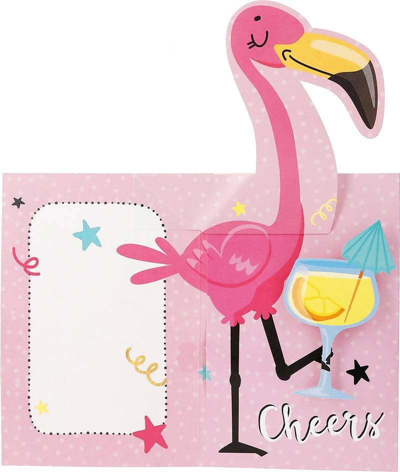 Doch die wahre Magie entfaltet sich beim Öffnen der liebevoll illustrierten Glückwunschkarte. In diesem Moment springt dem Betrachter der Kopf des Flamingos entgegen, der mit seinem einen Bein gekonnt einen Cocktail hält. Diese Pop-up-Überraschung sorgt nicht nur für einen unerwarteten Wow-Effekt, sondern verleiht dem Geburtstagsgruß eine lebendige und fröhliche Note.