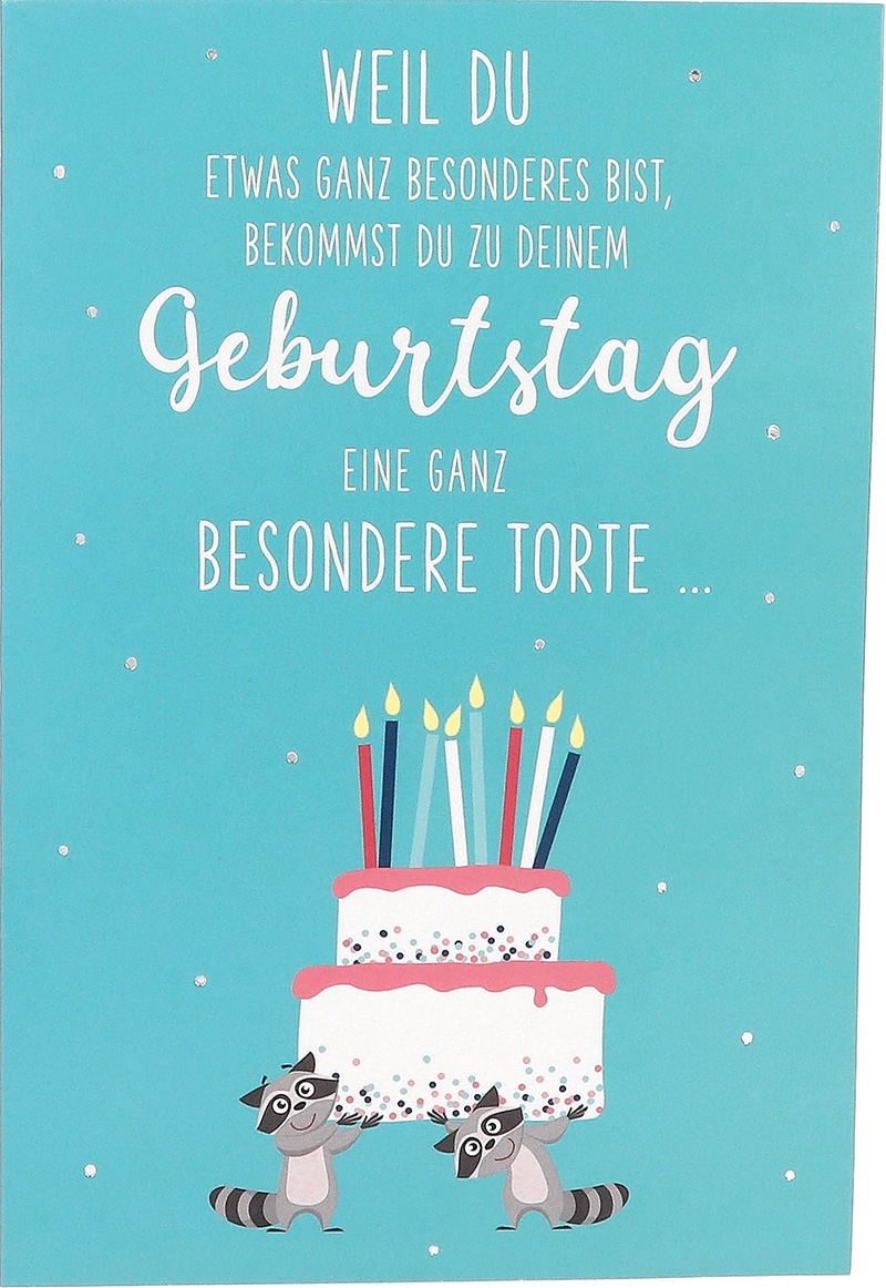 Die türkisfarbene Front dieser einzigartigen Kreation ist ein Fest für die Augen. Zwei niedliche Waschbären präsentieren stolz eine riesige Geburtstagstorte, übersät mit zahlreichen Kerzen, als würden sie sie persönlich für den Empfänger der Karte vorbereiten. Begleitet wird dieses Bild von einem herzlichen Spruch, der die Einzigartigkeit des Geburtstagskindes hervorhebt: “Weil Du etwas ganz besonderes bist, bekommst du zu deinem Geburtstag eine ganz besondere Torte…”.