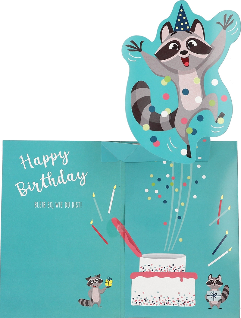 Doch der eigentliche Höhepunkt dieser Musikkarte offenbart sich erst beim Öffnen. Ein liebevoll gestalteter Pop-up-Waschbär springt aus der Torte heraus und begrüßt den Betrachter mit einem freudigen Lächeln. Gleichzeitig erklingt die zeitlose Melodie von “Happy Birthday”, die sofort eine festliche Stimmung verbreitet und jeden dazu einlädt, mitzusingen und zu feiern.