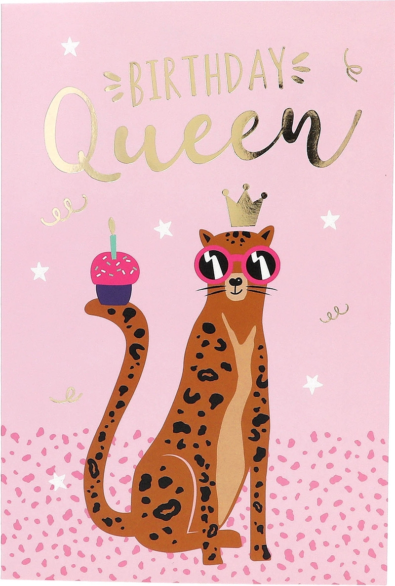 Die rosafarbene Front dieser besonderen Karte ist verziert mit einem verspielten Leoparden, der eine Krone und Sonnenbrille trägt. Ein Cupcake thront auf seinem Schwanz, als ob er darauf wartet, an diesem ganz besonderen Tag verspeist zu werden. Das Motto “Birthday Queen” prangt in mutigen Buchstaben über dem Bild, und verspricht schon von außen eine Feier voller Glamour und Freude.