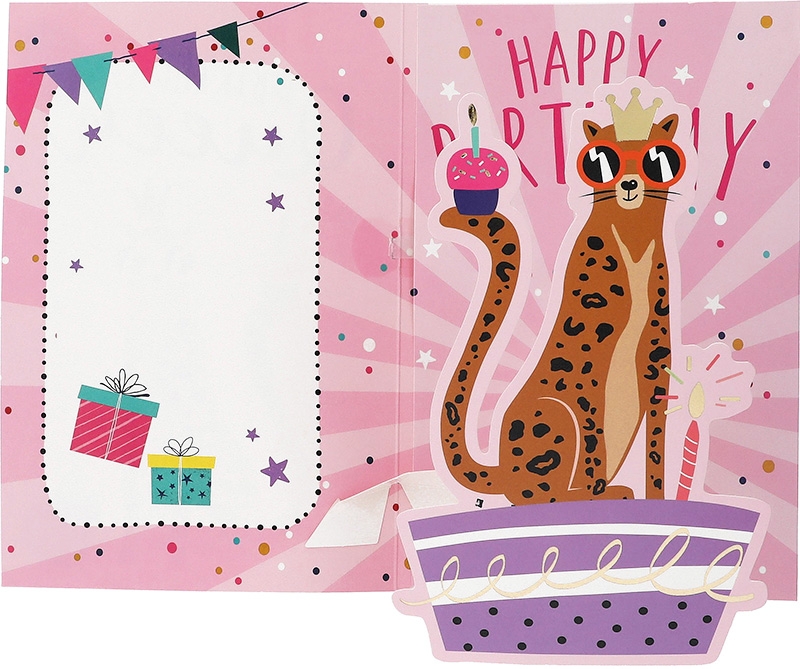 Doch der eigentliche Zauber dieser Karte entfaltet sich beim Öffnen. Einmal aufgeklappt, hüpft einem der niedliche Leopard entgegen, der sich gerade auf einem Geburtstagskuchen vergnügt. Die Illustration ist detailreich und liebevoll gestaltet, und verleiht der Szene eine lebendige Dynamik. Doch das ist noch nicht alles. Begleitet wird diese charmante Überraschung von den unvergesslichen Klängen von “Dancing Queen”, der jedem ein Lächeln ins Gesicht zaubert.