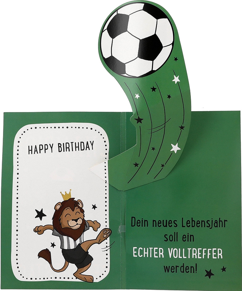 Die grüne Front dieser einzigartigen Musikkarte ist geschmückt mit einem Fußball, einem glänzenden Pokal und einem kraftvollen Spruch: “Ein echter Champion hat heute Geburtstag”. Doch das Beste kommt erst beim Öffnen der Karte. Ein liebevoll gestaltetes Pop-up-Design lässt einen Fußball durch die Luft fliegen, der von einem majestätischen Löwen getreten wird. Eine dynamische Szene, die die Energie und Begeisterung des Fußballsports einfängt.