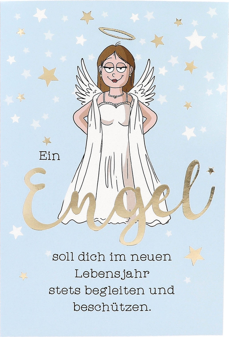 Die Vorderseite der Karte strahlt in einem sanften Hellblau und wird von funkelnden Sternen geschmückt. Im Mittelpunkt thront ein Engel mit Heiligenschein, der den Betrachter mit einem besonderen Versprechen begrüßt: “Ein Engel soll dich im neuen Lebensjahr stets begleiten und beschützen.”