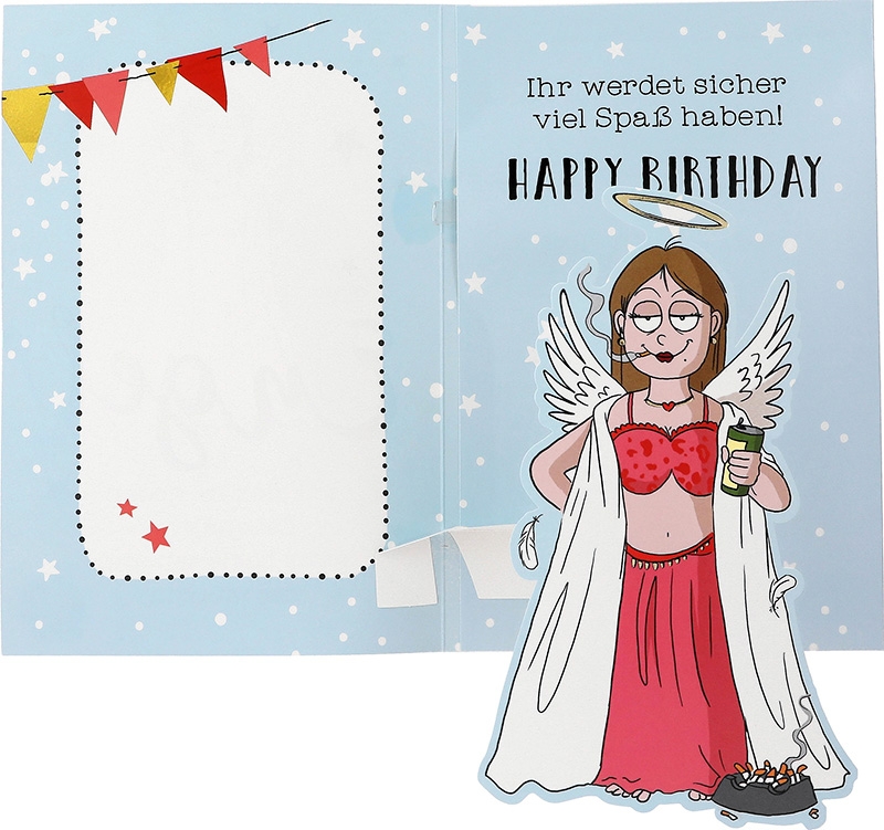 Doch die wahre Magie entfaltet sich beim Öffnen der Karte. Hinter der liebevoll illustrierten Fassade verbirgt sich ein himmlisches Schauspiel: Ein Engel in roter Unterwäsche, mit einem Bier in der Hand und einer Zigarette im Mund, begrüßt den Empfänger mit einem Augenzwinkern. Eine Szene, die für ein herzhaftes Lachen sorgt und gleichzeitig die unkonventionelle Seite des Engelchens zeigt. Als musikalische Begleitung erklingt dabei die mitreißende Melodie von “Girl on Fire”, die die Stimmung auf ein himmlisches Hoch katapultiert.