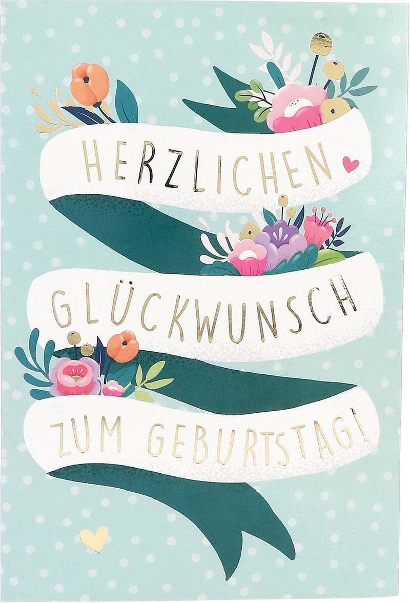 Die Vorderseite der Karte begrüßt den Empfänger mit einem frischen Grün, das mit verspielten Punkten und zarten Blumen verziert ist. Inmitten dieser liebevollen Details prangt der markante Schriftzug “Herzlichen Glückwunsch zum Geburtstag”, der den Ton für die festliche Atmosphäre der Karte setzt.