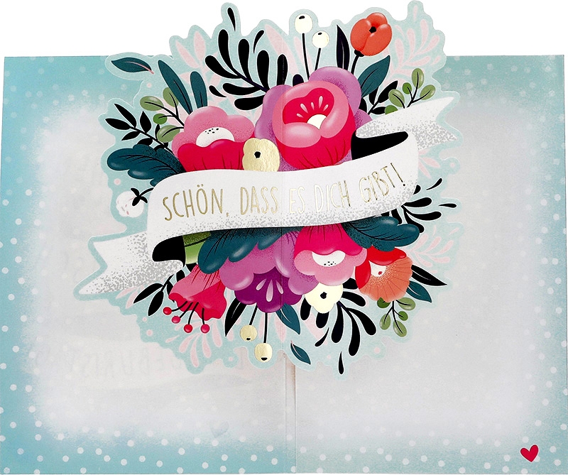Doch das wahre Highlight offenbart sich erst beim Öffnen. Ein üppiges Blumen-Bouquet entfaltet sich vor den Augen des Betrachters, als würde der Frühling direkt aus der Karte emporsteigen. Diese liebevoll gestaltete Pop-up-Überraschung fängt die Schönheit des Augenblicks ein und macht ihn unvergesslich.