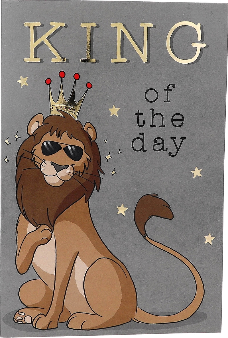 Die Vorderseite der Karte ist in einem dezenten Grau gehalten und wird von kleinen Sternen, einem lässigen Löwen mit Krone und Sonnenbrille sowie dem einprägsamen Schriftzug “King of the Day” geziert. Doch der wahre Zauber offenbart sich beim Öffnen der Karte. Ein liebevoll illustrierter Löwenkopf springt dem Betrachter entgegen und wird von der mitreißenden Melodie von “The Best” begleitet.