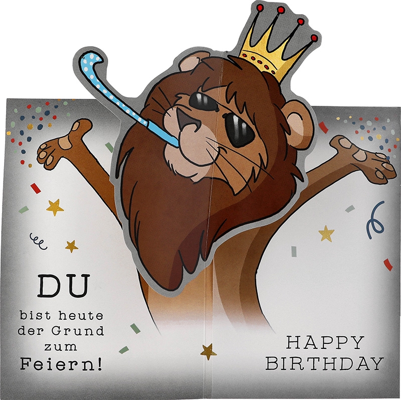 Doch das ist noch nicht alles. Neben dem majestätischen Löwen und der eingängigen Melodie erwarten den Empfänger weitere Überraschungen in Form von inspirierenden Sprüchen wie “Du bist heute der Grund zum Feiern” und “Happy Birthday”. Diese kleinen Botschaften, die Melodie und Pop-Up Überraschung verleihen der Karte eine zusätzliche Dimension und machen sie zu einem unvergesslichen Geschenk für jeden Anlass.