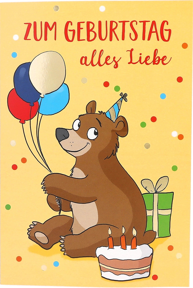 Die gelbe Front dieser bezaubernden Karte wird von einem fröhlichen Bären geziert, der stolz Luftballons trägt. Zudem umgeben ihn viele bunten Punkten und einer verlockenden Torte. Der einladende Spruch “Zum Geburtstag alles Liebe” rundet das Bild ab und verspricht ein Fest voller Freude und Herzlichkeit.