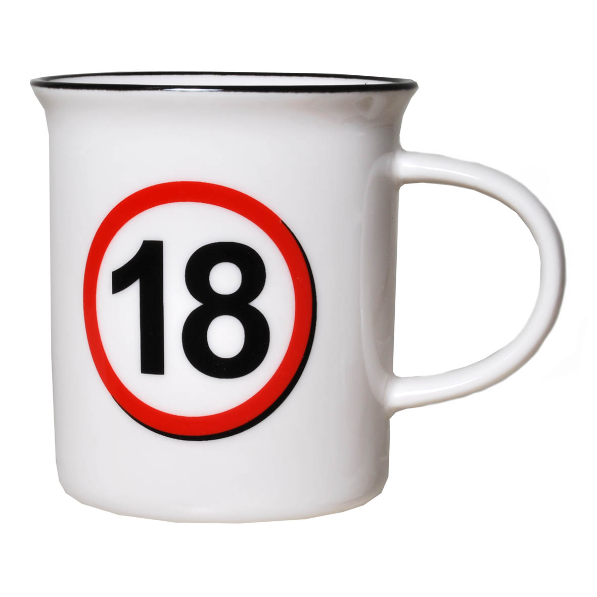 Dieser Becher, mit dem Motiv eines Verkehrsschildes und der schwarzen Zahl “18“, wird das Geburtstagskind immer an diesen schönen Tag erinnern.