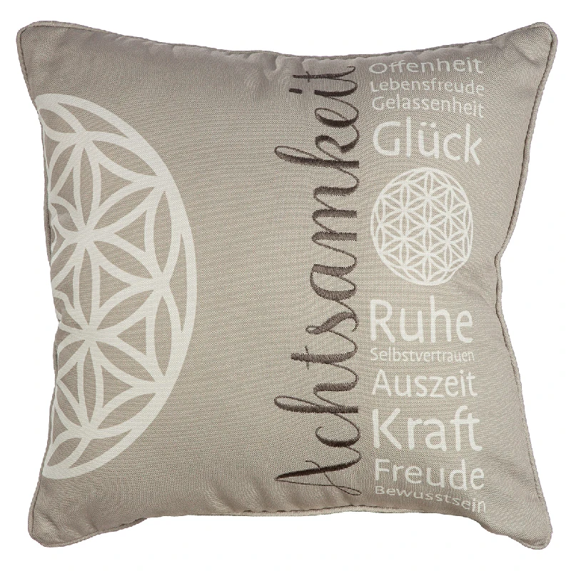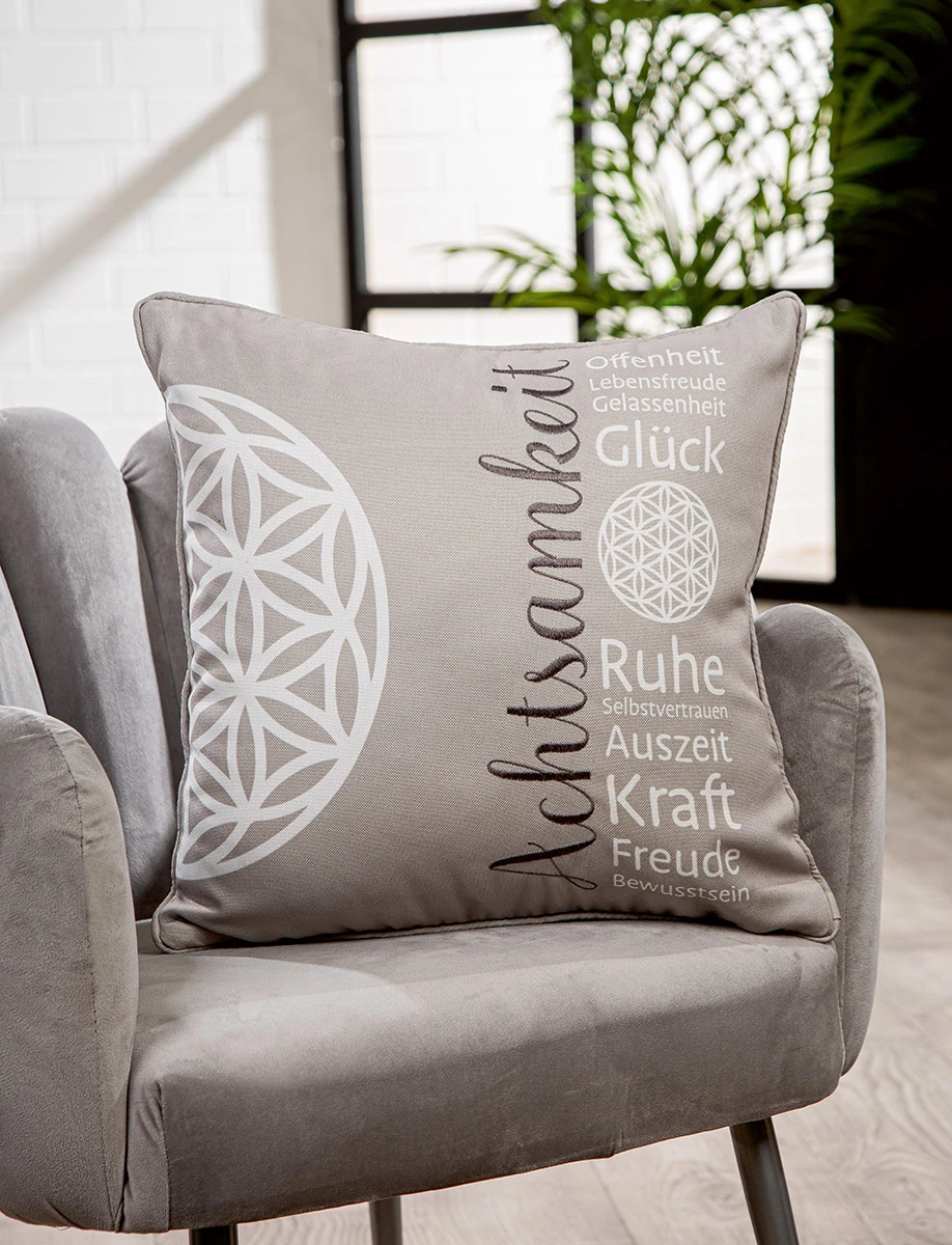 Besonders ausdrucksstark ist der Schriftzug, der sich über die Vorderseite des Kissens zieht: Achtsamkeit – Offenheit – Lebensfreude – Gelassenheit – Glück – Ruhe – Bewusstsein – Auszeit – Kraft – Freude. Begriff Achtsamkeit ist fein aufgestickt in Dunkelgrau, andere in strahlendem Weiß gedruckt – eine gelungene Kombination, die sowohl optisch als auch inhaltlich berührt.