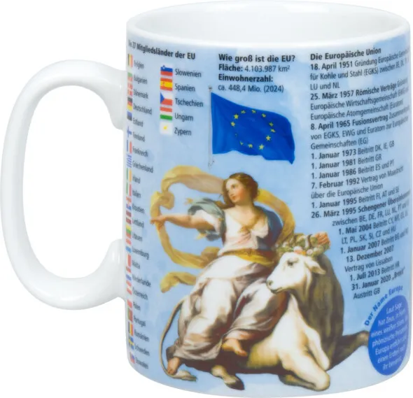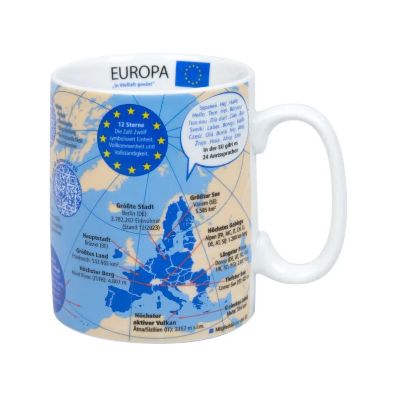 Zudem sind auf dem Becher praktische QR-Codes aufgedruckt, die Sie direkt zu weiteren Informationen über die Grundwerte der EU und zur offiziellen Europahymne führen. So wird aus einer simplen Trinkpause eine kleine, aber feine Bildungsreise – ganz ohne Aufwand, dafür mit umso mehr Freude.