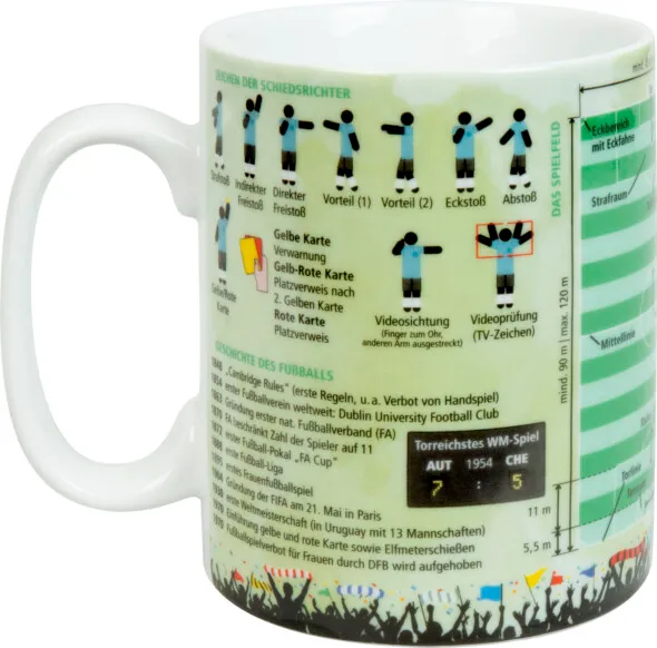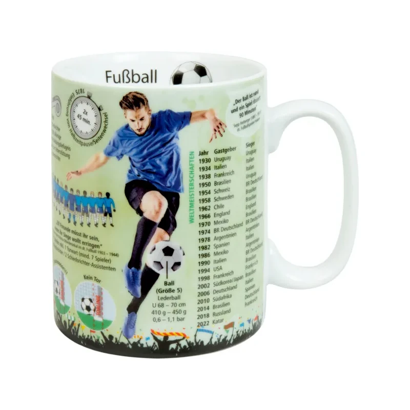 Mit viel Liebe zum Detail präsentiert der Becher die wichtigsten Fakten rund um das schönste Spiel der Welt. Wie groß ist eigentlich ein Fußballfeld? Seit wann gibt es Abseits? Welche Mannschaft holte den ersten Weltmeistertitel? – All das erfahren Sie auf einen Blick. So wird jede Tasse Kaffee oder Tee zum spannenden Wissensspiel.