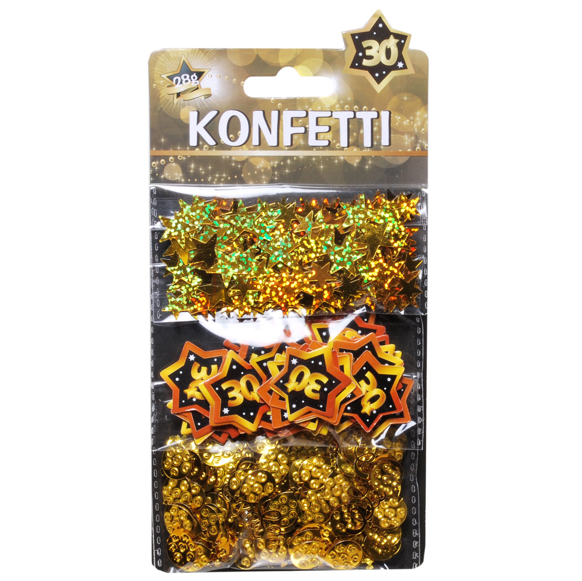 Das Konfettiset enthält einmal die Motive in Form von goldenen Sternen und Ballons. Außerdem enthält das Konfettiset schwarze, goldumrahmte Sterne mit dem Aufdruck: “30“.