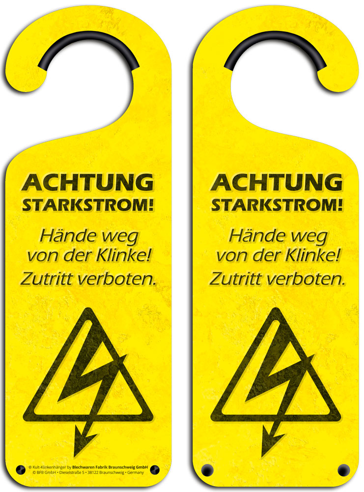 Dieser dekorative Kult-Klikenhänger ist hauptsächlich gelb mit dem Schriftzug ACHTUNG STARKSTROM! Hände weg von der Klinke! Zutritt verboten bedruckt und kann einfach an die Türklinke gehängt und gedreht und gewendet werden, wie man es gerade braucht.