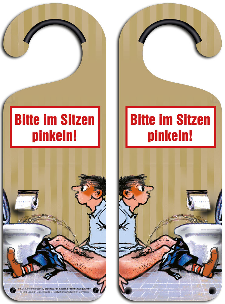 Dieser dekorative Kult-Klikenhänger ist mit dem Schriftzug Bitte im Sitzen pinkeln! und einem passenden lustigen Bild bedruckt und kann einfach an die Türklinke gehängt und gedreht und gewendet werden, wie man es gerade braucht.
