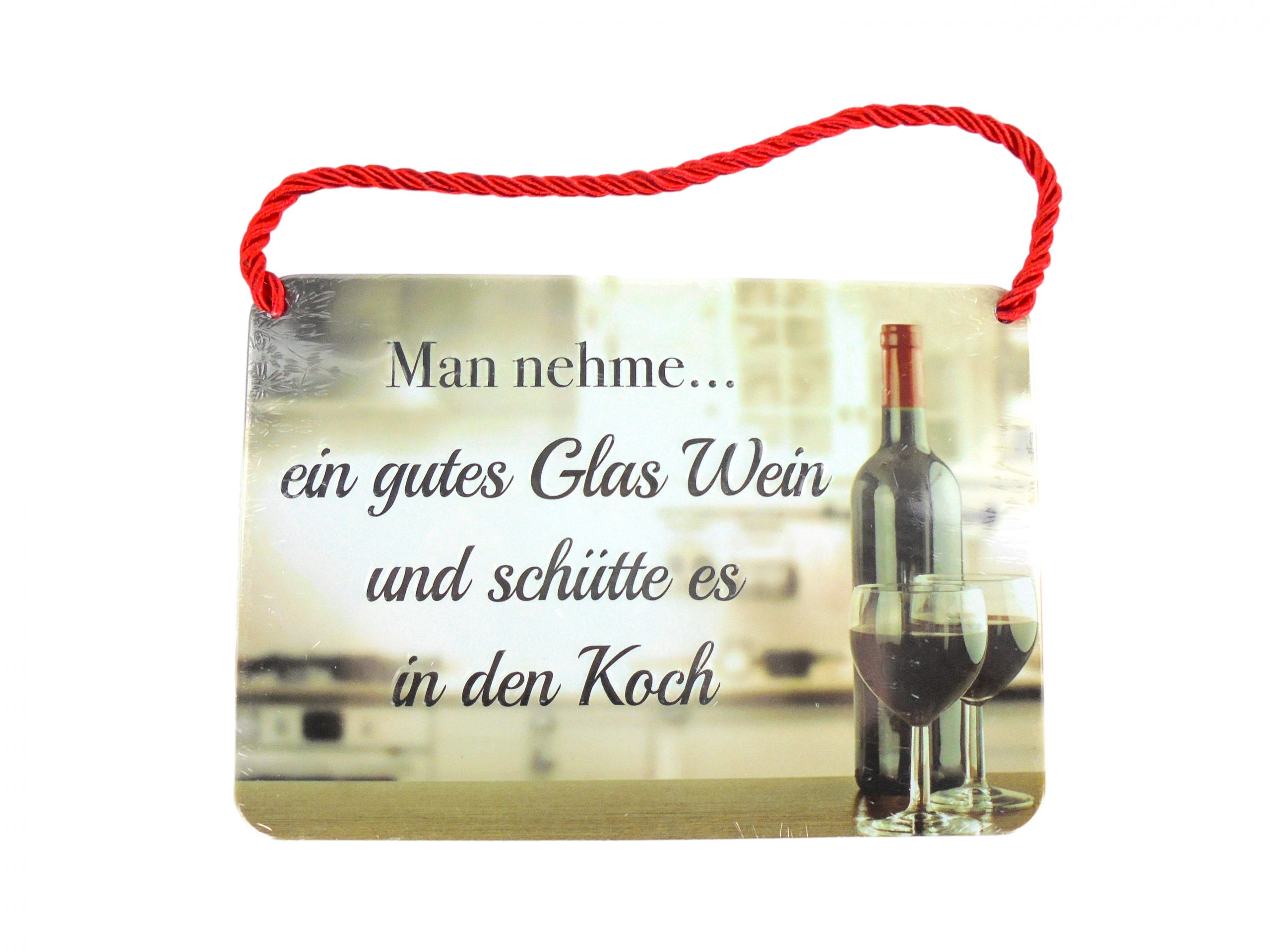 Das Kulthänger Blechschild „Glas Wein“ von der Blechwaren Fabrik ist eine originelle Dekoration für Weinliebhaber. Mit seinem humorvollen Spruch „Man nehme … ein gutes Glas Wein und schütte es in den Koch“ bringt es gute Laune und eine entspannte Atmosphäre in jedes Zuhause. Das liebevoll gestaltete Motiv mit zwei gefüllten Weingläsern und einer Weinflasche macht das Schild zu einem charmanten Hingucker.