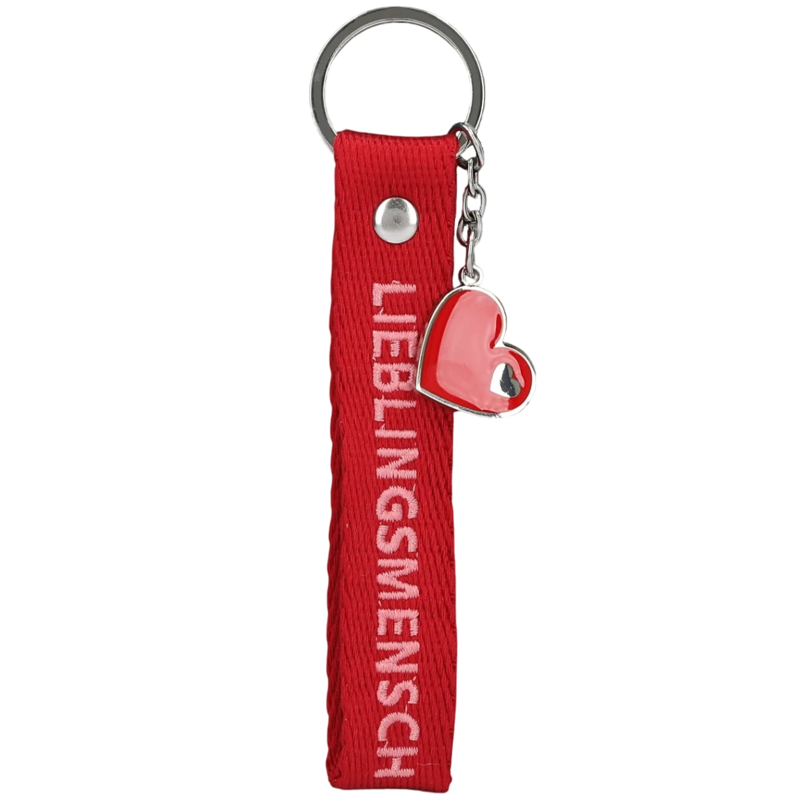 Der Schlüsselanhänger stammt aus der liebevollen Vergiss mich nicht-Serie von Depesche und besteht aus zwei wunderschönen Teilen. Zum einen ziert ein silberfarbenes Metallherz mit roter Emaille und einem kleinen silbernen Herzchen das Accessoire. Zum anderen sorgt eine kräftig rote Stoff-Schlaufe für Stabilität und Farbe. Auf der Schlaufe ist in zartem Rosa das Wort „Lieblingsmensch“ aufgestickt – schlicht und dennoch ausdrucksstark. Eine silberne Niete hält das Band sicher am stabilen Schlüsselring.