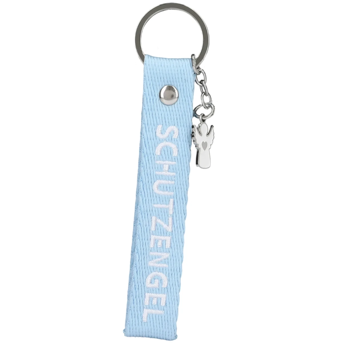 Der Schlüsselanhänger besteht aus zwei Elementen, die harmonisch miteinander kombiniert sind. Zum einen aus einem filigranen Engel-Anhänger aus silberfarbenem Metall mit weißer Emaille, detailreich gearbeiteten Flügeln und einem kleinen silbernen Herz. Zum anderen aus einer hellblauen, gewebten Stoff-Schlaufe, auf der das Wort „Schutzengel“ in weißer Stickerei hochwertig eingearbeitet ist. Eine silberne Niete befestigt die Schlaufe sicher am stabilen Schlüsselring – langlebig, stilvoll und praktisch zugleich.