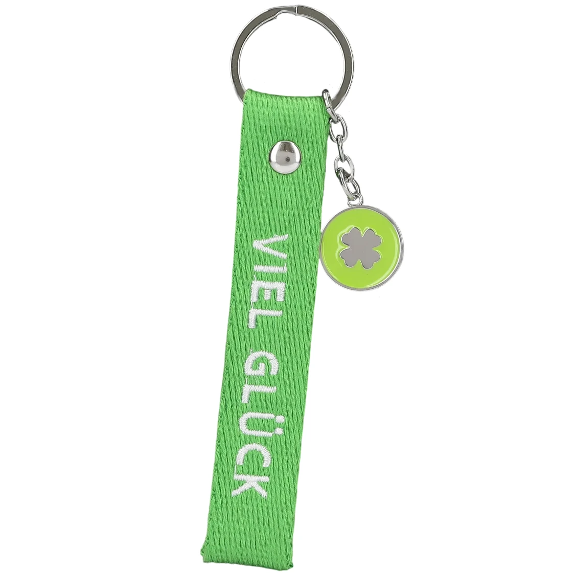 Der zweite Teil ist ein gewebtes Band in frischem Hellgrün. Es bildet eine praktische Schlaufe, die angenehm in der Hand liegt. Auf das Band ist der Schriftzug „Viel Glück“ in weißer Stickerei aufgebracht. Eine silberne Niete hält das Band sicher am Schlüsselring. So lässt sich der Schlüsselanhänger ganz leicht an jedem Schlüsselbund anbringen.
