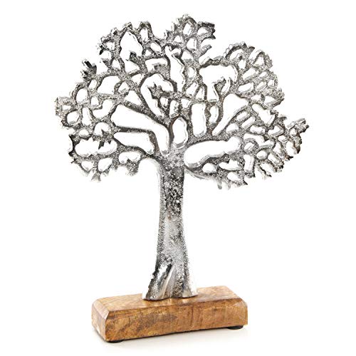 Die Vielseitigkeit dieses schönen Stücks erstreckt sich über jeden Einrichtungsstil. Egal, ob Ihr Zuhause einen modernen, antiken oder industriellen Touch hat, der Lebensbaum fügt sich nahtlos in jede Umgebung ein. Die silberne Eleganz gepaart mit dem warmen Ton des Holzsockels schafft eine harmonische Balance, die zu jeder Wohnungseinrichtung passt.