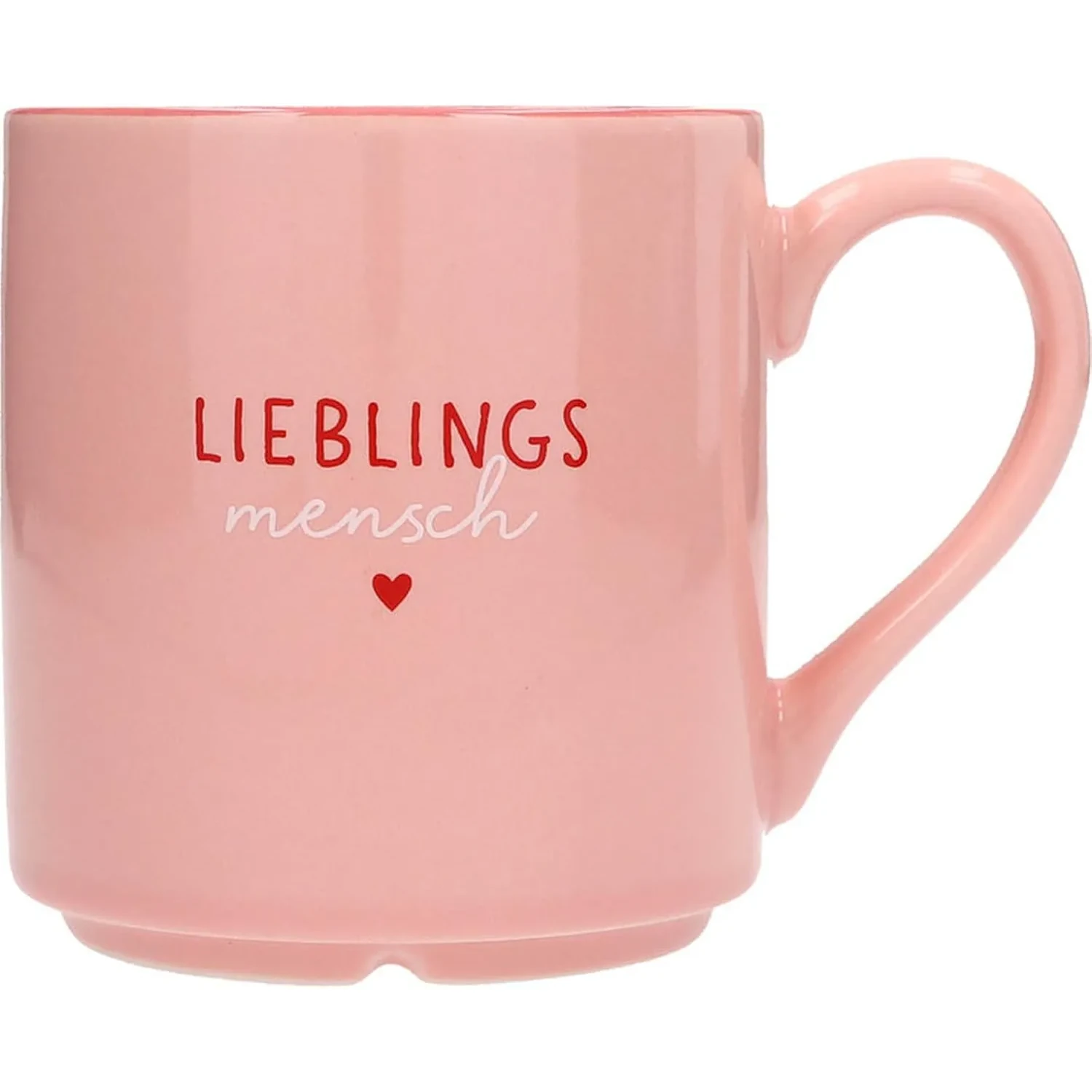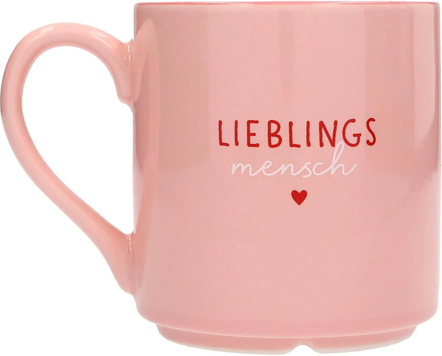 Gestalterisch überzeugt der Lieblingsbecher „Lieblingsmensch” mit einer zarten, harmonischen Zweifarbglasur: außen hellrosa, innen ein satteres, dunkleres Rosa. Auf der Vorderseite prangt der liebevolle Schriftzug „Lieblingsmensch“, ergänzt durch ein kleines rotes Herz – dezent und doch voller Gefühl. Als besonderes Highlight befindet sich am Boden der Innenseite ein aufgedrucktes weißes Herzchen – ein kleines, liebevolles Detail, das beim Austrinken des Lieblingsgetränks sichtbar wird.