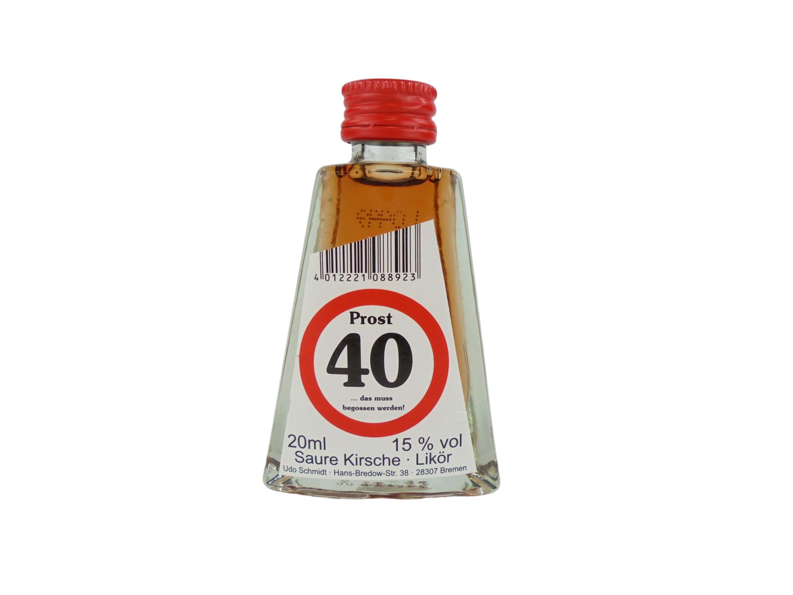 Dann schenken Sie doch einfach diese kleine Flasche Likör. Die Flasche mit ihrer besonderen Form, hat auch ein besonderes Etikett. Ein Verkehrsschild mit rotem Rand auf weißem Untergrund ist mit der Zahl “40” versehen.