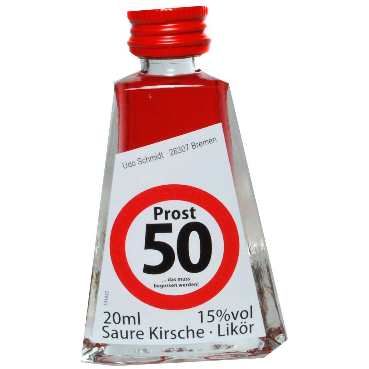 Dann schenken Sie doch einfach diese kleine Flasche Likör. Die Flasche mit ihrer besonderen Form, hat auch ein besonderes Etikett. Ein Verkehrsschild mit rotem Rand auf weißem Untergrund ist mit der Zahl “50” versehen.