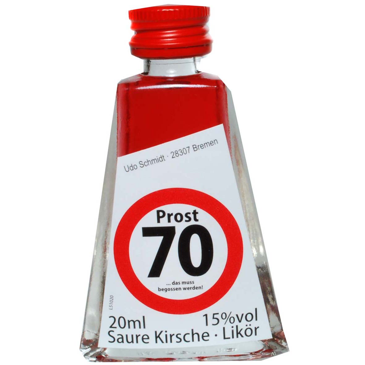 Dann schenken Sie doch einfach diese kleine Flasche Likör. Die Flasche mit ihrer besonderen Form, hat auch ein besonderes Etikett. Ein Verkehrsschild mit rotem Rand auf weißem Untergrund ist mit der Zahl “70” versehen.