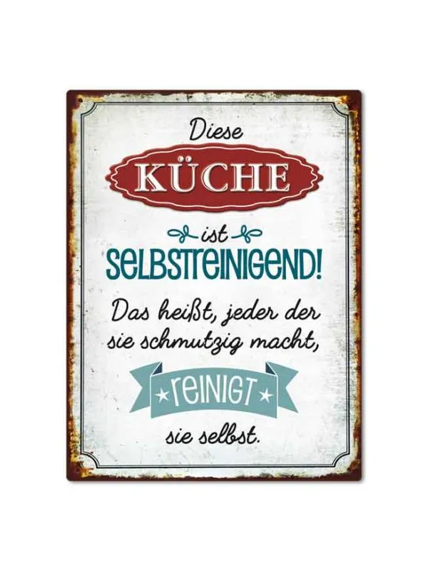 Der witzige Schriftzug „Diese Küche ist selbstreinigend! Das heißt, jeder der sie schmutzig macht, reinigt sie selbst.“ bringt die Botschaft mit Stil auf den Punkt. Die Gestaltung im angesagten Vintage-Look mit charmanten Rosteffekten verleiht dem Magneten ein rustikales, aber gleichzeitig modernes Aussehen – perfekt für jede Küche, egal ob Landhaus oder urbaner Chic.
