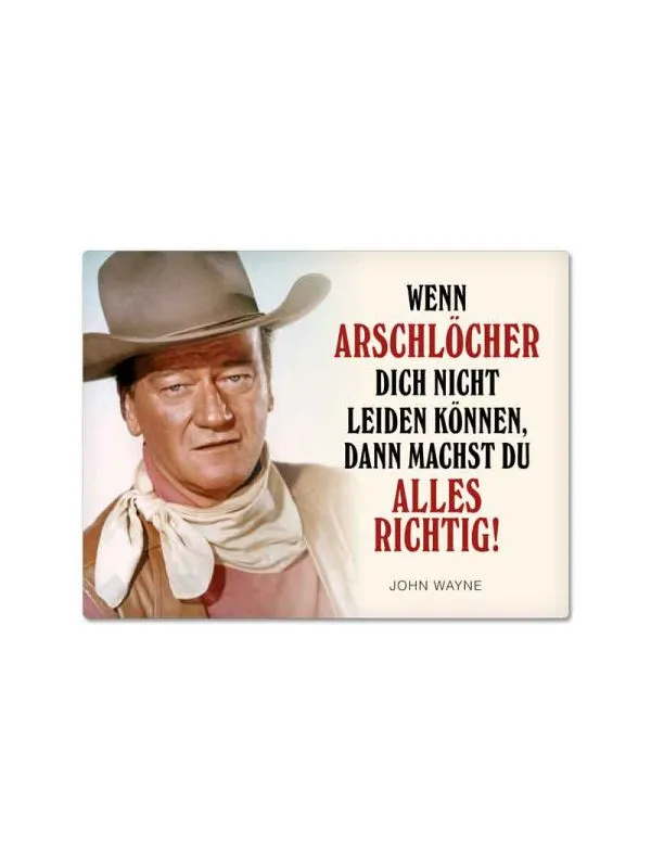 Der Magnet „Du machst alles richtig!“ ist mehr als nur ein Kühlschrankmagnet – er ist ein klares Statement, ein täglicher Mutmacher und ein stilvoller Begleiter durch Ihren Alltag. Mit seinem markanten Design, der edlen 3D-Prägung und dem kraftvollen Spruch sorgt er nicht nur für Ordnung, sondern auch für gute Laune. Das Zitat „Wenn Arschlöcher dich nicht leiden können, dann machst du alles richtig!“ bringt es auf den Punkt – frech, ehrlich und voller Selbstbewusstsein. Der legendäre Western-Held John Wayne mit Cowboyhut verleiht dem Motiv zusätzliche Stärke und Charakter.