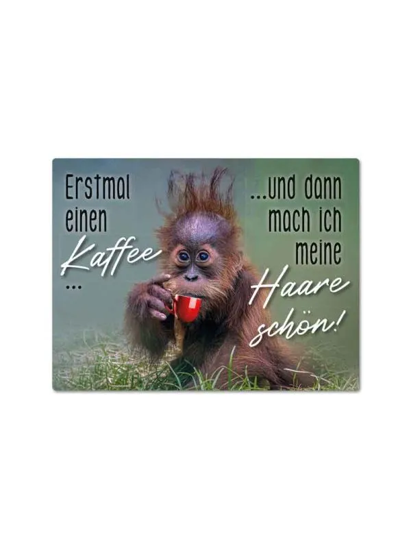 Mit seiner edlen Aluminiumoberfläche und der detailreichen 3D-Prägung ist der Magnet ein echter Hingucker. Das Motiv: ein verschlafener kleiner Affe, dem die Haare zu Berge stehen, mit einer dampfenden Kaffeetasse in der Hand. Daneben der Satz: „Erstmal einen Kaffee und dann mach ich meine Haare schön!“ – treffender kann man viele Morgen nicht beschreiben.