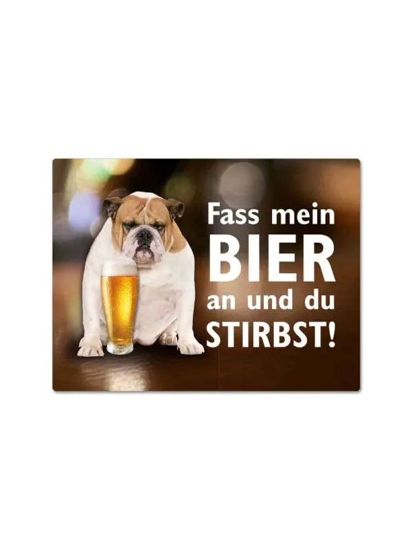 Die hochwertige Aluminiumoberfläche mit aufwendiger 3D-Prägung macht den Magneten zu einem echten Hingucker. Das Motiv zeigt einen finster dreinblickenden Bulldog vor einem frisch gezapften Bier – dazu die deutliche Botschaft: „Fass mein Bier an und du stirbst!“ Dieser augenzwinkernde Warnhinweis sorgt garantiert für Lacher – ob in der Küche, am Kühlschrank, an der Magnettafel im Büro oder auf der Werkzeugwand in der Garage.