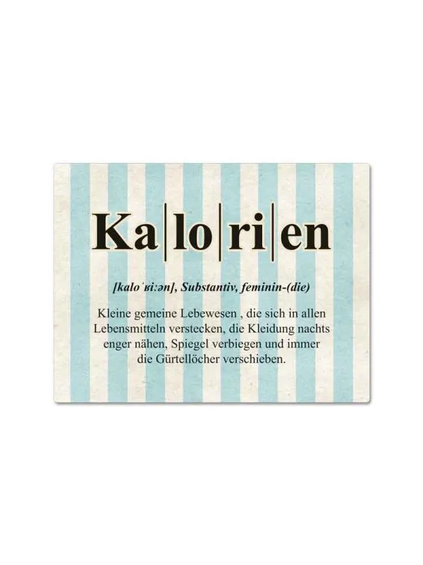 Doch dieser Magnet kann noch mehr: Er bringt Menschen zum Schmunzeln! Das liebevoll gestaltete Motiv zeigt eine humorvolle Definition des Wortes „Kalorien“ im Stil eines Lexikoneintrags. Der hellgrau-blau gestreifte Hintergrund verleiht dem Design eine moderne Leichtigkeit und fügt sich perfekt in jede Einrichtung ein. Besonders charmant wird der Magnet durch seine klare Botschaft: eine augenzwinkernde Erinnerung für all jene, die gerne naschen oder mit sich selbst über den nächsten Kühlschranksnack verhandeln.