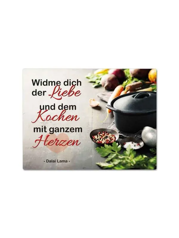 Das bezaubernde Motiv zeigt eine stimmungsvolle Küchenszene mit einem Kochtopf, frischem Gemüse, Kräutern und Gewürzen. Daneben prangt das bedeutungsvolle Zitat von Dalai Lama: „Widme dich der Liebe und dem Kochen mit ganzem Herzen.“ Diese Botschaft erinnert Sie jeden Tag daran, wie wertvoll Hingabe und Leidenschaft sind – sei es beim Kochen oder im Leben.