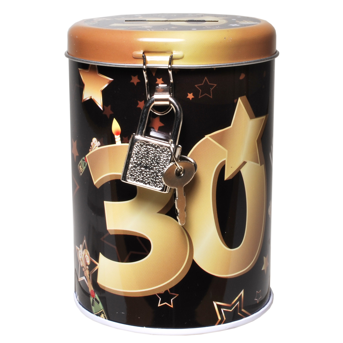 Diese schöne Blechspardose ist mit einem kleinen Metall- Vorhängeschloss versehen. Sie kann oben aufgeklappt werden, um das Geld zu entnehmen und dann wieder verschlossen werden. Rundherum ist sie mit vielen kleinen goldenen Sternen versehen. Eine tolle Idee das Geld schön zu verpacken.