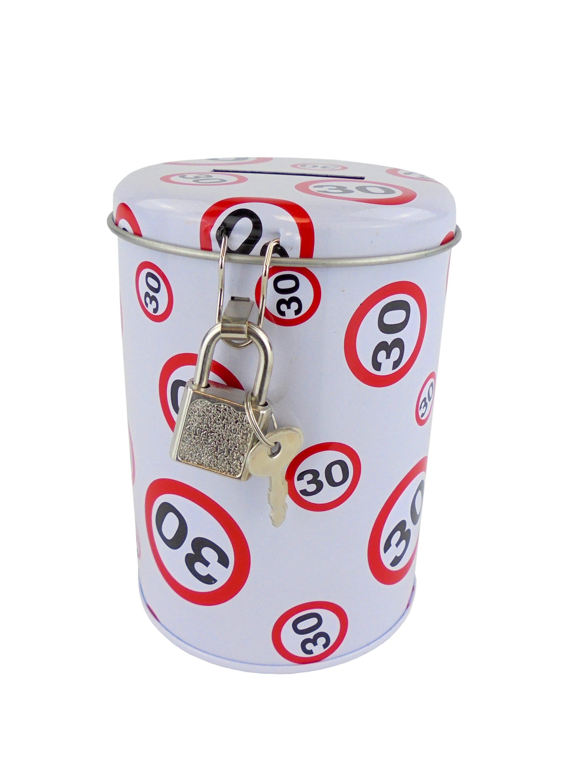 Diese schöne Blechspardose ist mit einem kleinen Metall- Vorhängeschloss versehen. Sie kann oben aufgeklappt werden, um das Geld zu entnehmen und dann wieder verschlossen werden. Rundherum ist sie mit vielen kleinen runden Verkehrsschildern versehen. Eine tolle Idee das Geld schön zu verpacken.